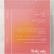 This unique and stylish all in one wedding invitation features a colourful gradient ombré effect in shades of pink and orange. This wedding tri-fold invitation is a wedding invitation, enclosure card and RSVP card in one! Customise it with your own wedding information and return address. A super easy way for your wedding guests to send back RSVP cards! The colourful gradient background and minimal typography and text makes this wedding invitation card unique. This wedding invitation template is part of a suite with more wedding stationery including wedding invitations, RSVP cards and more.