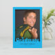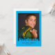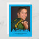 This simple photo graduation invitation features modern retro typography on top of the vertical photo. The background is a bright blue with custom text for the grad's name, year and invitation details on the back side.