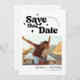Modern trendy wedding save the date card with retro typography font and your photo. Elegant simple black and white design with 70's retro groovy funky twist.