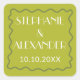 Set against a vibrant citrus green background, this square sticker immediately stands out while still feeling polished and intentional. Clean, modern typography highlights the couple’s names and wedding date, creating a striking focal point that feels confident and contemporary. A hand-drawn wavy border frames the design, adding organic movement and a subtle retro charm that ties seamlessly into the matching invitation suite.