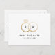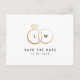 A modern monogram gets glam with intertwined faux gold wedding rings and simple personalised text making this save the date postcard a new classic with streamlined text in clean black and white. Personalise all of the text of this minimal save the date and add an engagement photo for a pared down and simple look all while directing your guests to save the date for your big day.