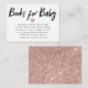Modern book request invitation insert for a girl's baby shower. The text on top says "books for baby " in a modern script font with texts asking the guests to bring a book for your baby instead of a card. There is a rose gold pink glitter heart in the middle that matches the colour on the back of the card.
