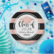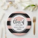 Custom graduation paper plates feature the class year and graduate's name in a stylish and elegant black calligraphy script with rose gold / blush pink coloured grad cap and bold stripe patterned background. Scroll accent design.