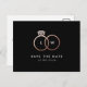 A modern monogram gets glam with intertwined faux rose gold wedding rings and simple personalised text making this save the date postcard a new classic with streamlined text in soft dusty rose on classic black. Personalise all of the text of this minimal save the date and add an engagement photo for a pared down and simple look all while directing your guests to save the date for your big day.