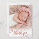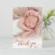 Modern Elegant Chic Calligraphy Rose Gold Script Photo Newborn Baby Girl Thank You Card. Features a pretty "thank you" text in a handwritten swash tail font calligraphy script in blush pink rose gold faux foil. At the back side pre-made personal message. Great for baby girl. Easy to personalise with your baby photo and details.
