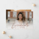 A Modern Rose Gold Script Photo Graduation Announcement with handwritten font full bleed horizontal photo on the front with name and graduation details. The back has a second photo and additional details. Click the edit button to customise this design.