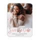 Modern wedding save the date announcement keepsake magnet featuring photo, "Save the Date" written in a stylish rose gold faux foil script and your wedding date in simple typography.