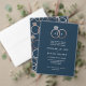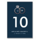 Featuring interlocked faux foil rose gold wedding rings, this double sided navy blue table number is a great addition to your reception decor. Personalise all the text including the two letter couple's monogram, the table number and get creative with the two lines of text at the bottom like your new last names, wedding date, location and even custom table names or a note about your love story.