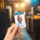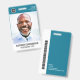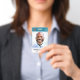 A modern and simple badge that does not distract from the important details. Easy to read from afar. Add a custom logo and company details. Add the employee's name, photo, and professional title. The bar of colour can be modified to match the company's official colours. At the back, add more information such as return address and the employee's ID number. Perfect for round shaped logos.
