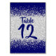 This modern table number card has a silver glitter effect on a deep royal blue background. You can change the font style and colour and also add each table number individually by going to the customise menu. This is part of a wedding suite with a matching menu, place cards and other essentials.