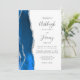 The left-hand edge of this elegant modern wedding invitation features a royal blue watercolor agate border trimmed with faux silver glitter. The customisable text combines handwriting, copperplate and italic fonts in charcoal grey on a white background. The reverse side features a matching royal blue and silver agate design.