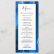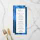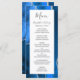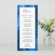 This elegant, modern wedding menu features a watercolor royal blue agate background trimmed with silver faux glitter. The text appears in elegant charcoal grey handwriting and copperplate fonts on a white rectangle. The agate design is repeated on the reverse.