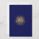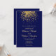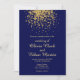 This elegant modern wedding invitation has a splash of gold confetti on a rich a royal blue background.