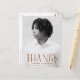 Simple graduation thank you postcard featuring the graduate's vertical photo with "Thanks" displayed in rust-brown, modern art deco lettering. Personalise the front of the photo graduation thank you postcard by adding the graduate's name, school name, and graduation year. The postcard reverses to display your return address and provides space for your typed or handwritten thank you message.