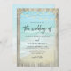 This modern script beach wedding invitation features a coastal scene with ocean waves crashing against the shore, framed with rustic grey driftwood, and decorated at the top with string lights. These wedding invitations are perfect for destination weddings, as well as any beach and coastal themed wedding.