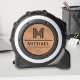A handsome tape measure featuring a bold, modern striped monogram initial with a custom name on a warm faux wood grain background. The clean, masculine design makes it a sharp personalised gift for handy dads, groomsmen, contractors, or anyone who appreciates good tools and great style. The initial and name are fully customisable.