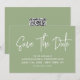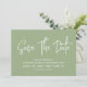 Modern calligraphy save the date in sage green with a digital scannable QR code for a website or contact information on the back.