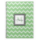Personalised spiral notebook features sage green chevron pattern with custom name in black and monogram in matching green shade.