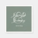 These custom wedding paper napkins feature a modern and minimalist white calligraphy script design on a simple sage green background. Personalise with your names and wedding date. Best of wishes for your wedding and marriage! Designed by Susan Coffey.