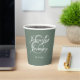 This custom wedding paper cup features a modern and minimalist white calligraphy script design on a simple sage green background. Personalise with your names and wedding date. Best of wishes for your wedding and marriage! Designed by Susan Coffey.