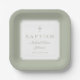 Modern Sage Green Religious Cross Boy Baptism Square Paper Plates.