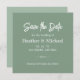 Make your wedding announcement in style with this simple and modern Save the Date invitation. This minimalist invitation card features classic typography against a sage green background, which can be personalised with any custom text or greeting of your choice. The back of the card features a convenient QR code, allowing your guests to access a personalised page on your wedding website, where they can easily RSVP and learn more about your special day.