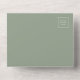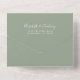 The left-hand edge of this elegant modern all-in-one wedding invitation and RSVP features a silver faux glitter border. The customisable text combines white whimsical handwriting, copperplate and italic fonts on a sage green background. The return address appears on the outside flap and the reverse side of the detachable RSVP card in white text on solid sage green.
