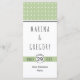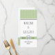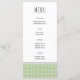 Modern sage green typography wedding menu card that features a white geometric pattern on sage and a banner with your wedding date.