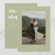 Modern Sage Green Wedding Elopement Reception Invitation. Customise with a favourite wedding photo, bride and groom names, and your wedding date on the front, and add your 'we eloped' message and reception invite info to the back of this elegant and minimalistic sage green wedding announcement card and party invitation.