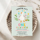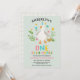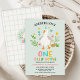 Sweet silly goose themed first birthday invitation featuring a goose, basket, colorful flowers and foliage. This one silly goose birthday invitation also features some multicolored text and a sage background.