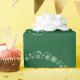 Elegant and cute personalised Christmas wrapping paper with Santa in his sleigh pulled by a unicorn with golden and red glitter in his mane and tail, various snowflakes, and Xmas trees decorated with silver baubles. Perfect for little kids, especially little girls who like unicorns. With the greeting "Merry Christmas / Emma!" in cursive script / calligraphy. Make sure you personalise the name. On a Xmas green background.