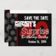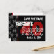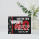 Here's a trendy save the date postcard in black and white with accents of red for a surprise 40th birthday party. Fun! All text is customisable.