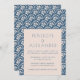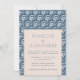 This modern botanical wedding invitation features a minimalist composition and simple typography in blue and white with a stylish floral pattern.