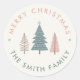 Round Christmas sticker with pastel trees, modern typography and festive holiday design in a minimalist Scandinavian style.