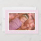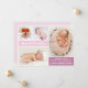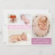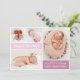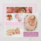 Modern, Girly Pink Mauve Baby Birth Announcement 4 Photo Collage Cards. Elegant adorable 2-sided photo birth announcement template card featuring four (4) of your favourite baby photos on front, with a pretty hand lettered script in whitw on pastel soft pink and mauve or light purple colour blocks. Add your baby's name on the front and birth stats. On the back side there's one horizontal baby photo on blush pink white dotted background. You can easily personalise it.