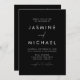 Simple and elegant all-in-one wedding invitations featuring a white, handwritten script mixed with modern lettering against a black background. Personalise the front of the minimalist wedding invitation with your name and wedding details. Personalise the back of the invitation with wedding details such as reception information, hotel accommodations, RSVP instructions, and wedding website. Add your desired wedding website link to the provided QR Code template so your guests can easily RSVP online and view additional wedding information. The black and white all-in-one wedding invitations are the perfect choice for modern weddings.
