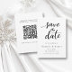 This elegant black-and-white wedding save-the-date card is perfect for a modern wedding. The simple design features elegant black calligraphy on a clean white background. The card also includes a QR code for the wedding website on the back.