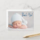 Create a personalised and heartfelt thank you postcard for your baby shower guests with this Modern Script Blue Baby Boy Photo Baby Shower Postcard. This horizontal format postcard allows you to easily customise it with your own newborn's photography, message, baby's birth details, sign-off, and return address.