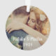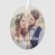 Simple and elegant photo ornament design for a newlywed couple's first married Christmas features modern custom white script monogram text for names and the year that can be customised to any font or colour. Include two different wedding photos on each side of the ornament, or one favourite photo on both sides.