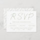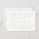 This contemporary wedding RSVP response card boasts a sleek, minimalist design with a hint of sophistication. The addition of the word 'RSVP' in sage green script calligraphy gives a modern edge to the monochromatic palette. The back of the card showcases a repeated pattern of the same sage green text, tying the design together seamlessly. Personalisation options are available for adjusting the text size to accommodate longer or shorter names, ensuring a flawless fit.