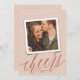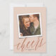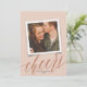 This modern yet elegant new year's photo card features a large script "cheers" in rust over a neutral pinkish tan background with a single square photo. Over the photo is a faux photo frame image - actual design is not 3D. On the back of the card is the same tan colour. **ALL colours are customisable - background colour, text colour, even the calligraphy script colour! Just click "customise design further" in the dropdown menu.**