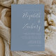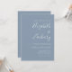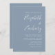 This simple modern wedding invitation features white text on a dusty blue background. Add the names of the bride and groom in stylish handwriting calligraphy and the details in sans serif font. The reverse side is a matching shade of solid dusty blue.