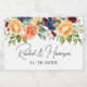 Charming wedding sparkling wine labels featuring a scattered watercolor floral pattern in peach, blue, and burgundy tones with greenery throughout, framing the couple's names in modern script calligraphy and wedding date. The all-over botanical design creates an eye-catching personalised mini bottle favour for your wedding celebration. All text is fully customisable.