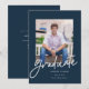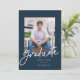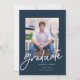 Graduation announcement featuring a modern script with a navy background. The back allows for extra wording, which could double as an invitation.