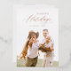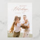 Modern minimalist happy holidays card design features elegant trendy script in real rose gold foil, with personalised family photo, simple and unique.