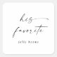 These modern script his favourite wedding favour stickers are perfect for a minimalist wedding. The simple black and white design features unique industrial lettering typography with modern boho style. Customisable in any colour. Keep the design minimal and elegant, as is, or personalise it by adding your own graphics and artwork. Personalise with the groom's favourite snack or candy.