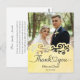 This picture is a wedding thank you card featuring a photograph of a couple, with decorative elements and text.