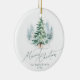 Personalized Christmas ornament features watercolor pine tree and elegant merriest Christmas script in sage green, modern and simple. Custom your own family name.