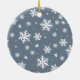 Stylish photo ornament design for the holidays features your favourite family image with Merry Christmas text in modern brushed script lettering. Personalise the custom text with your last name or family name and the year. A simple pattern of white winter snowflakes dresses up the back of the ornament. The slate blue grey background colour can be customised to coordinate with your holiday decor. Photo tip: crop photo to square format before uploading it to the design template.