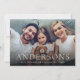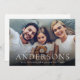 Modern minimalist merry Christmas card design features family name in elegant trendy script and typography, with personalised family photo, simple and unique greeting cards.